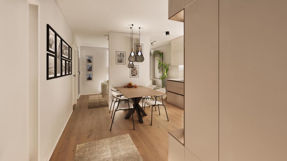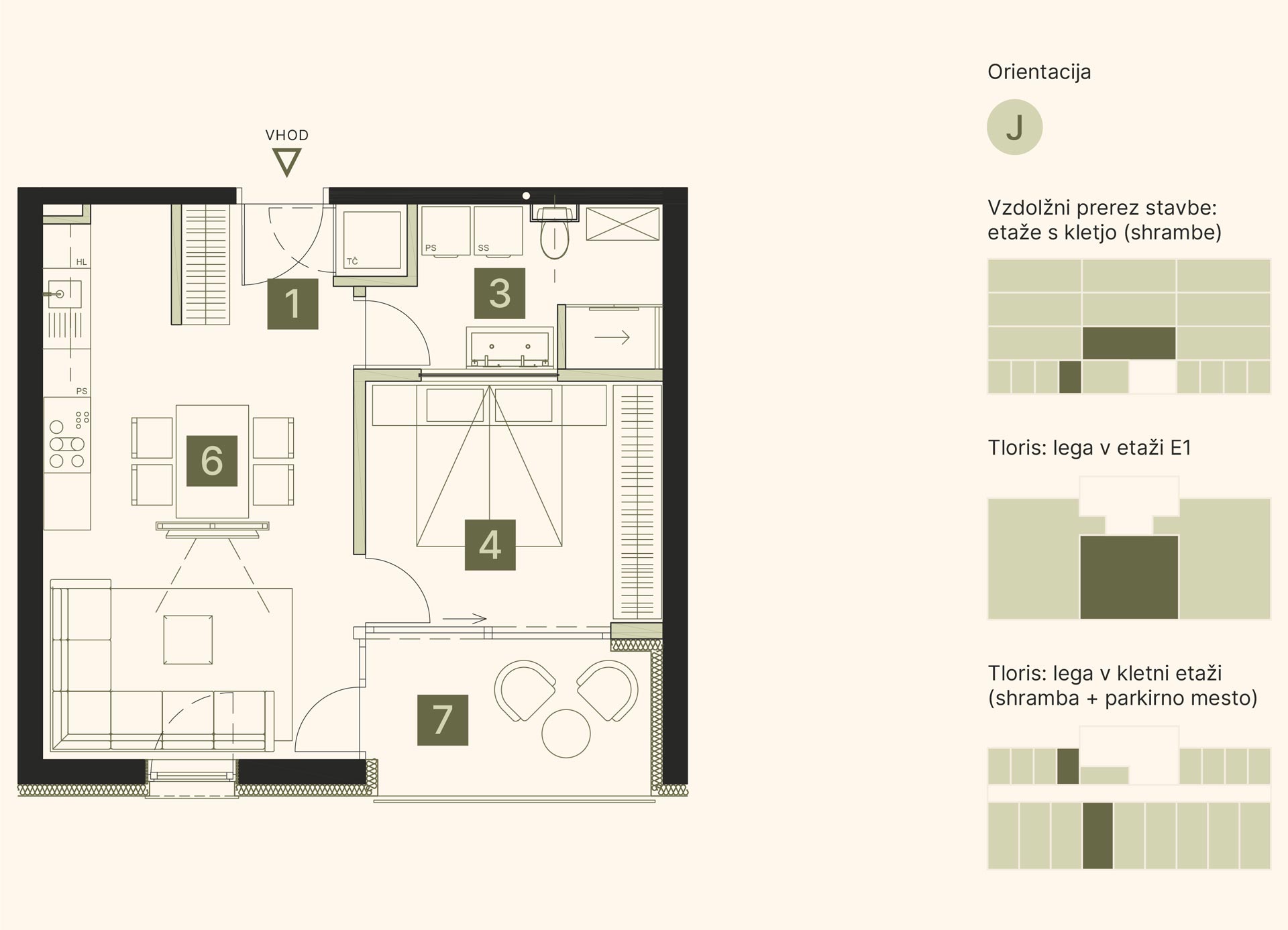 Svetlo in funkcionalno zasnovano dvosobno stanovanje vključuje predprostor, kopalnico, spalnico, skupni dnevni prostor s kuhinjo in jedilnico ter ložo. Stanovanju pripadata dve lastniški parkirni mesti: eno zunanje, pred objektom, in drugo pokrito, v kletni etaži, s predpripravo za električno polnilnico in shrambo.
