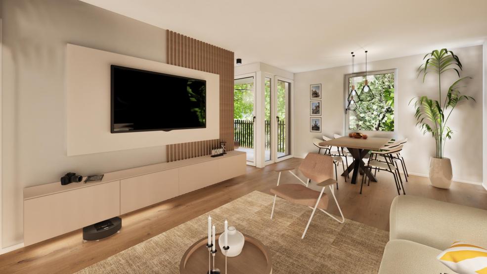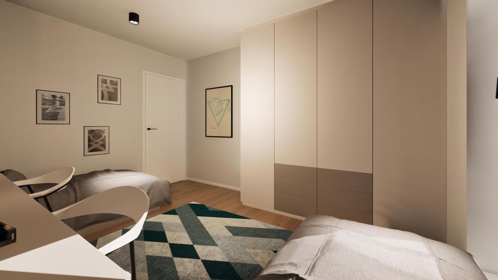 Svetlo in funkcionalno zasnovano trisobno stanovanje vključuje predprostor, utility, kopalnico, spalnico, sobo, skupni dnevni prostor s kuhinjo in jedilnico ter južno orientirano ložo. Stanovanju pripadata dve lastniški parkirni mesti: eno zunanje, pred objektom, in drugo pokrito, v kletni etaži, s predpripravo za električno polnilnico in shrambo.